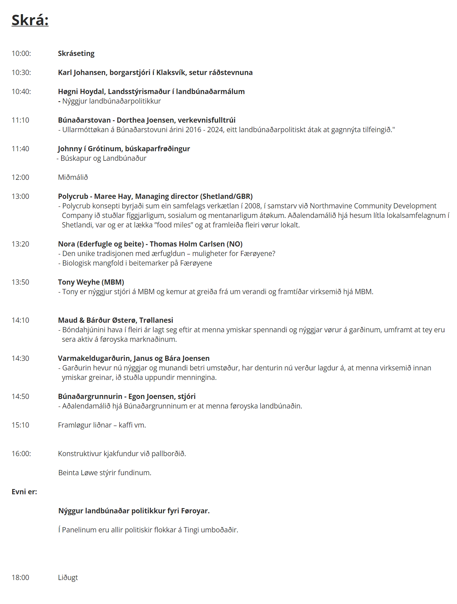 Umframt fleiri spennandi framløgur, verður fokus sett á tann nýggja landbúnaðarpolitikkin, sum nú er sendur til hoyringar.