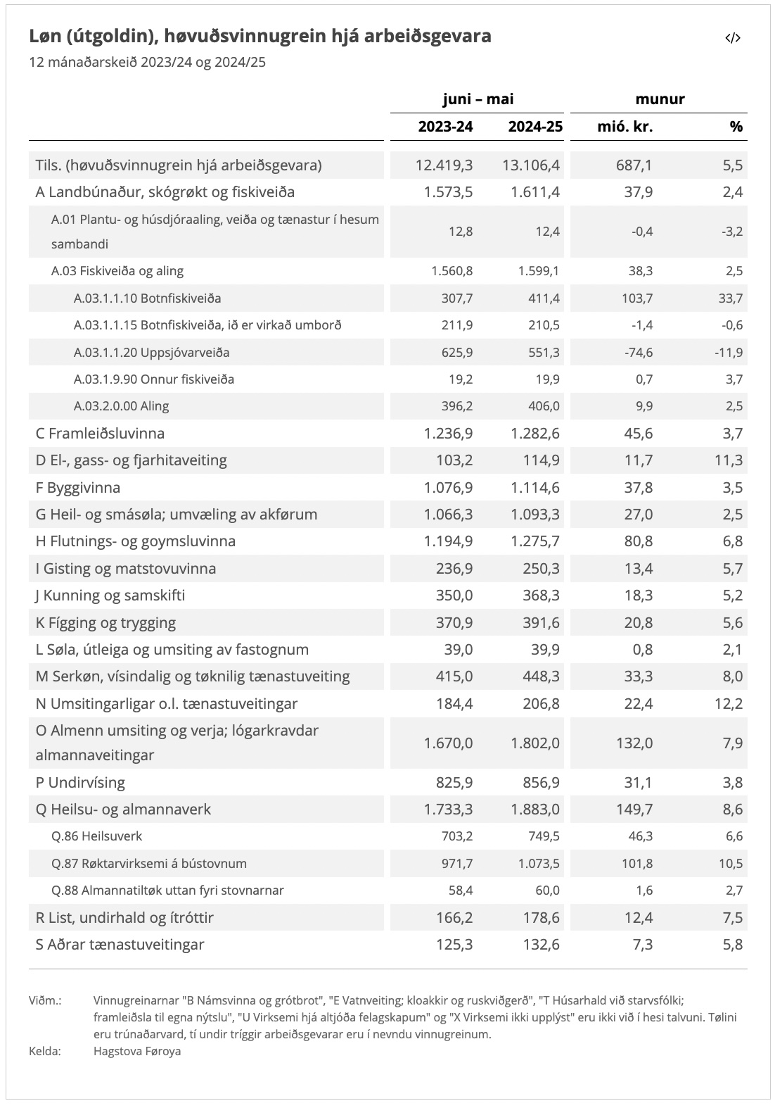 Knappar 690 milliónir krónur, ella 5,5 prosent, fleiri lønarkrónur vórðu útgoldnar í tíðarskeiðinum frá juni 2024 til mai 2025 samanborið við undanfarnu 12 mánaðirnar.