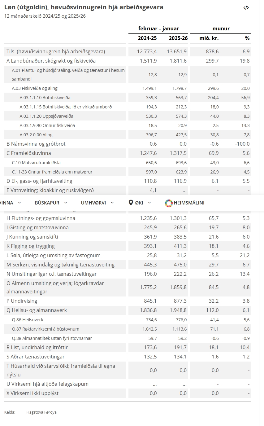 879 milliónir krónur, ella 6,9 prosent, fleiri lønarkrónur vórðu útgoldnar í tíðarskeiðinum frá februar 2025 til januar 2026 samanborið við undanfarnu 12 mánaðirnar.