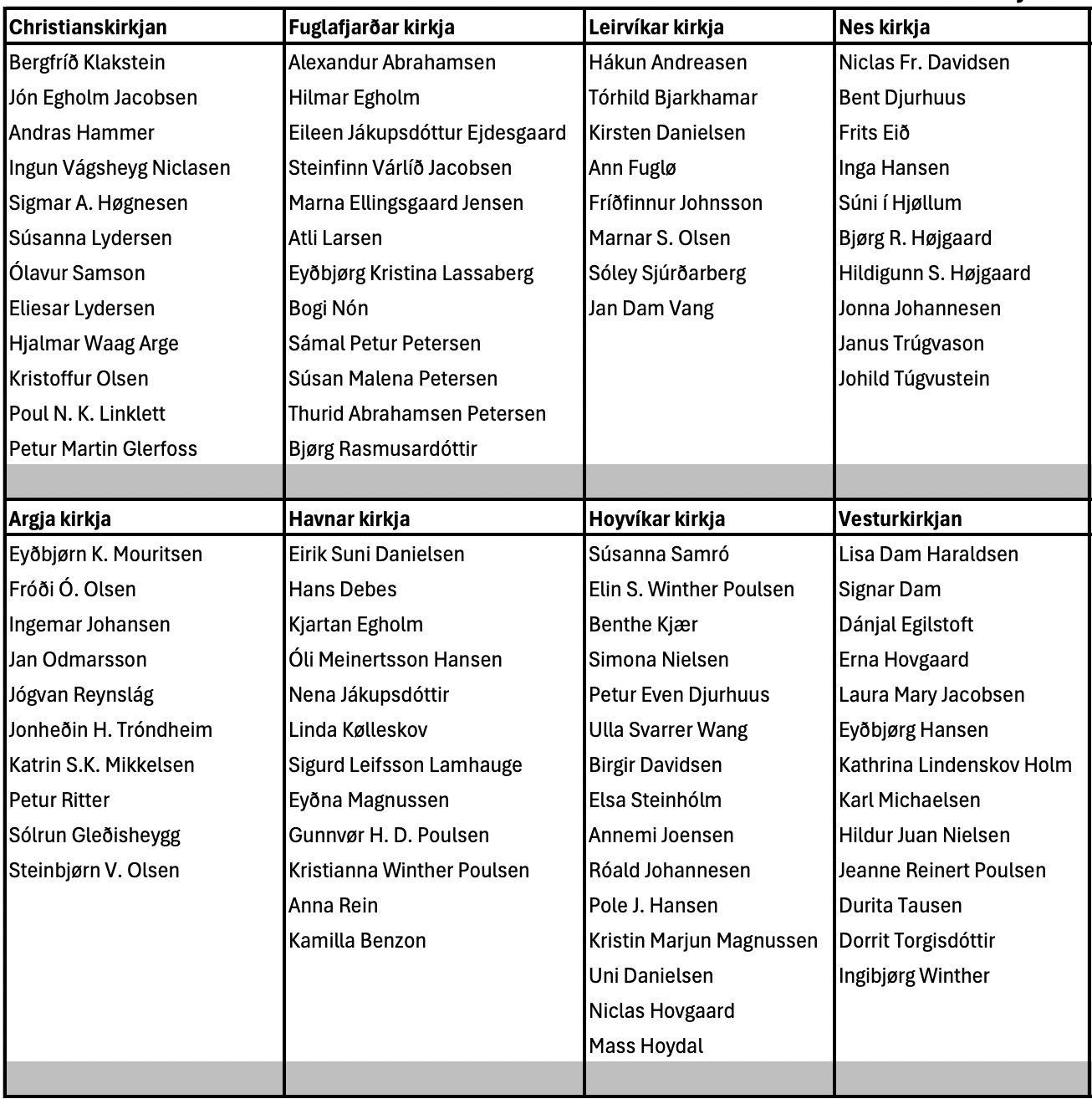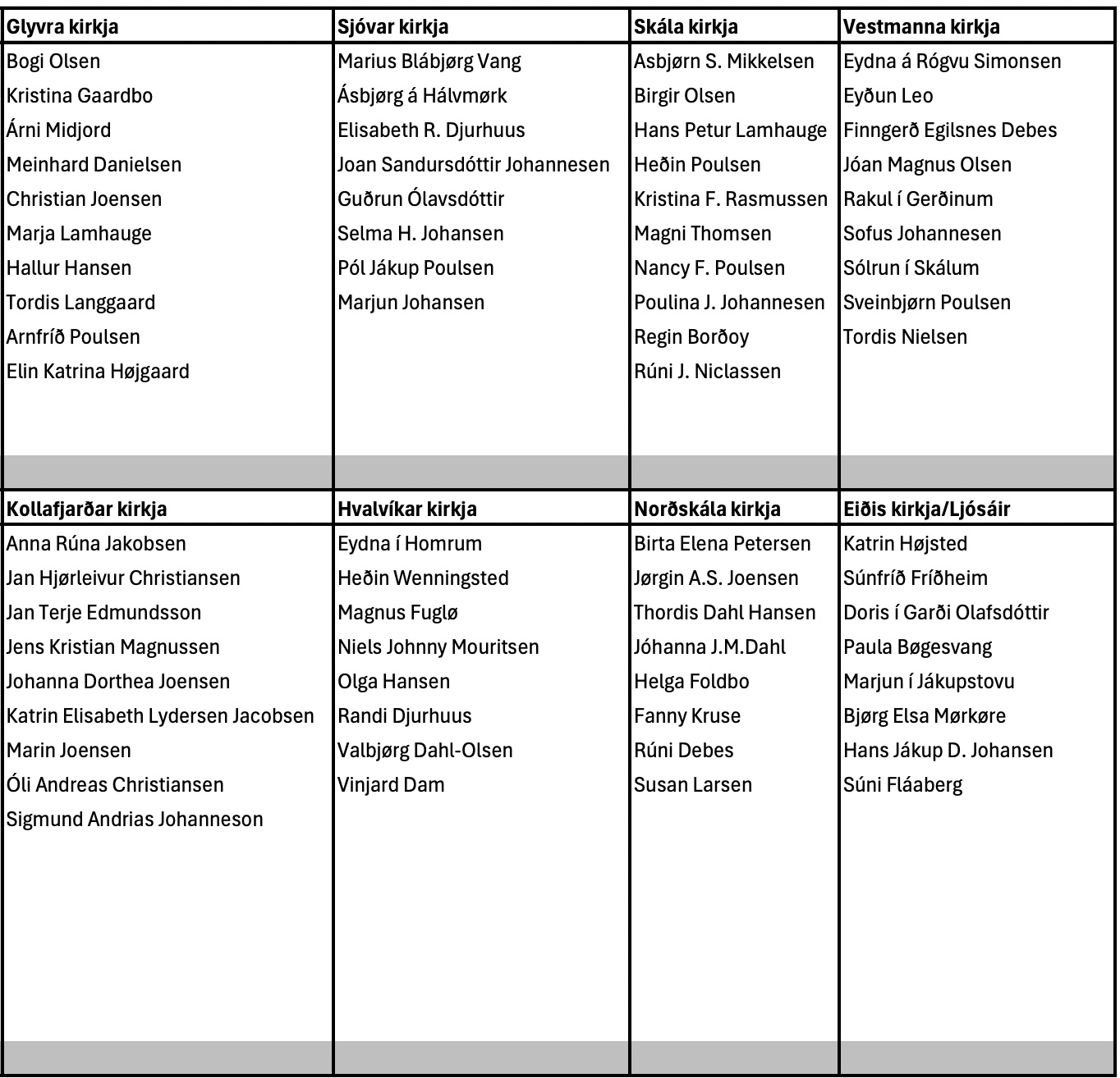 226 valevni hava stillað upp, harav 115 kvinnur og 111 menn. Í hesum kirkjusóknum eru 41.478 limir. Av teimum hava 32.384 valrætt, ella 78,1%.