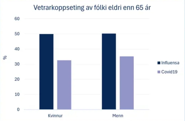Tað er Heilsustýrið sum hevur gjørt tølini, sum vísa, at 50 prosent av teimum, sum eru 65 ár og eldri, tóku av tilboðnum og  lótu seg koppseta fyri influensu og 34 prosent vórðu koppsett fyri COVID19. At kalla eingin munur er millum kynini.