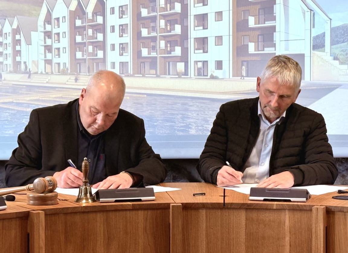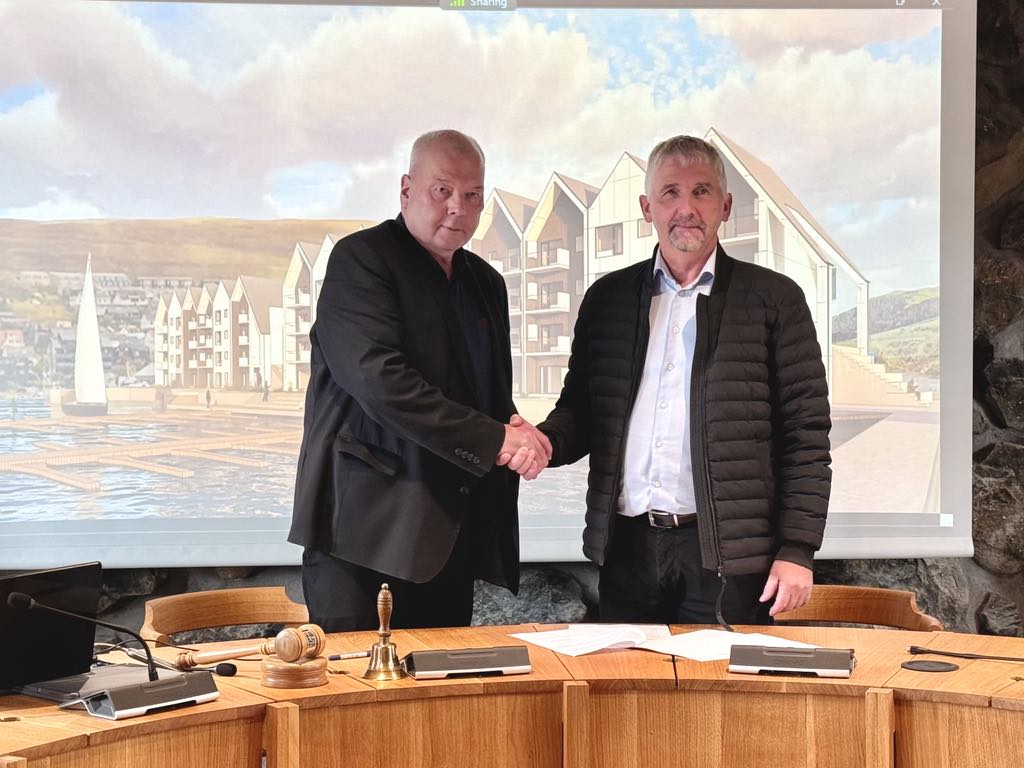 Seinrapartin í dag – í býráðssalinum á Glyvrum - skrivaðu Jóan Petur Vang og Tórbjørn Jacobsen undir leigusáttmála um lendi í miðbýarøkinum í Runavík. Fyri tað hevði fundur verið í fíggjarnevndini og eykabýráðsfundur, har ið uppskotið til sáttmála var einmælt samtykt.