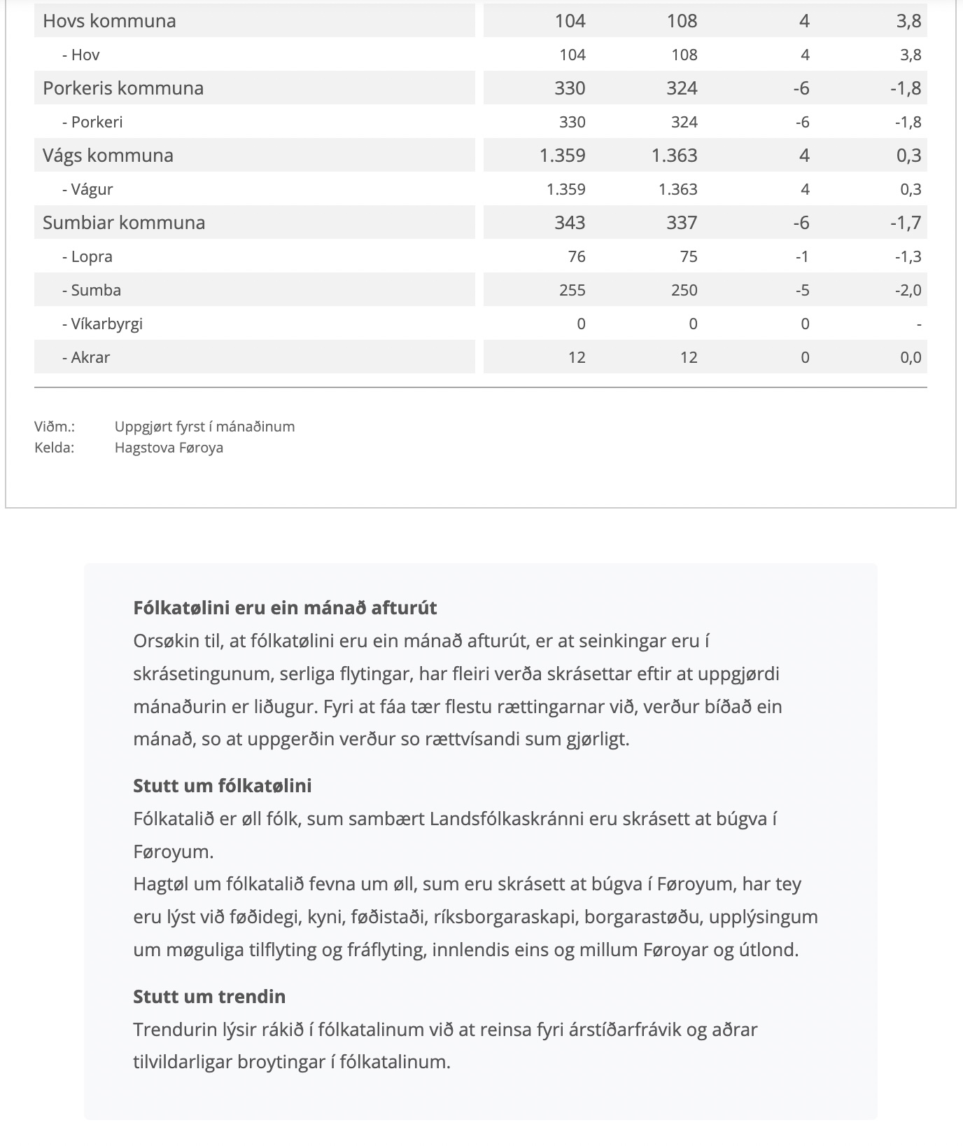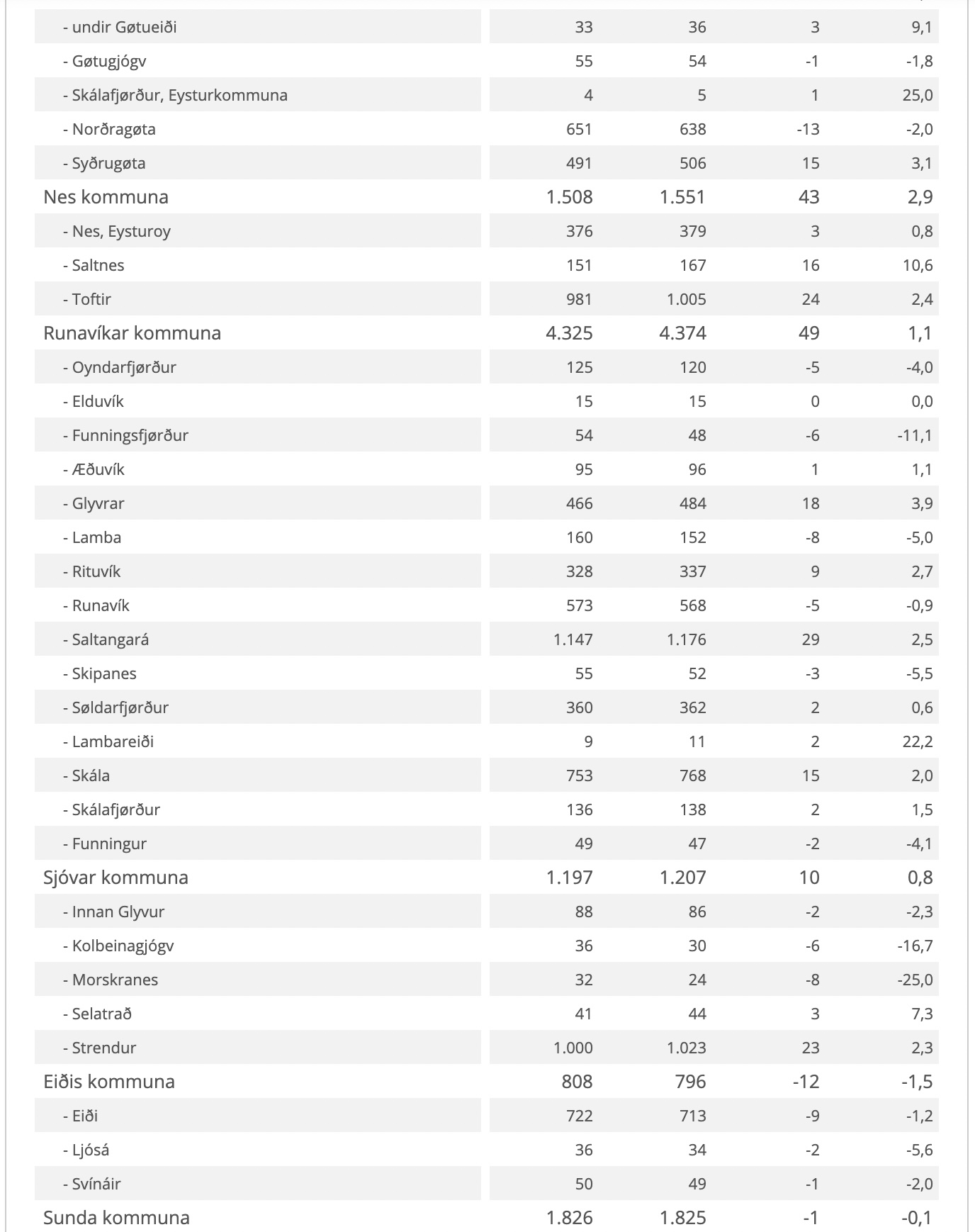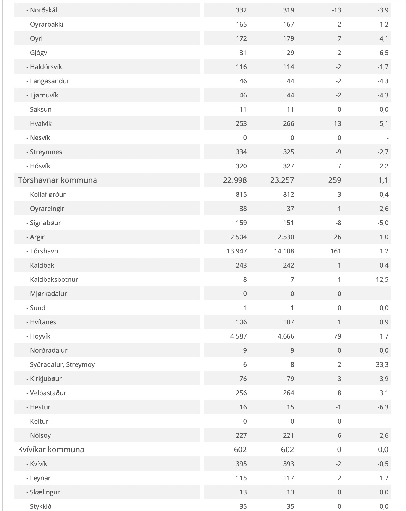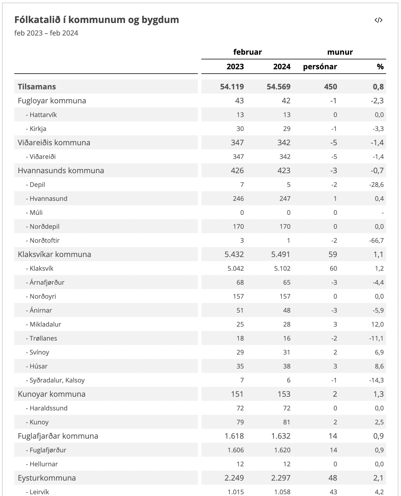 Hóast fólkavøksturin er minkandi í landinum sum heild, so høvdu 14 av teimum 29 kommununum fólkavøkstur seinasta árið. Størsti vøkstur var í Tórshavnar, Klaksvíkar, Runavíkar og Eysturkommunu. Í teimum kommununum vaks fólkatalið serliga í Tórshavn, Hoyvík, Klaksvík og í Leirvík. Fólkatalið var óbroytt í tveimum og minkaði í 13 kommunum. Størsta minking var í Hvalbiar kommunu. Sí fleiri tøl í talvuni niðanfyri, sum vísir fólkatalið í kommununum við tilhoyrandi bygdum 1. februar 2023 og 2024.