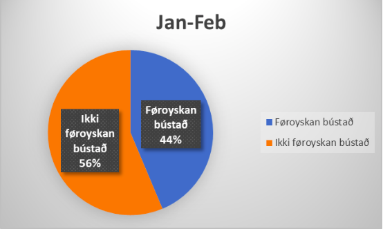 Um hugt verður at tjóðskapinum hjá teimum ferðandi er áhugavert at staðfesta, at av ferðafólkunum fyrstu tveir mánaðirnar, eru tað 56%, sum siga seg hava bústað aðrastaðni enn í Føroyum, meðan 44% eru búsitandi í Føroyum.