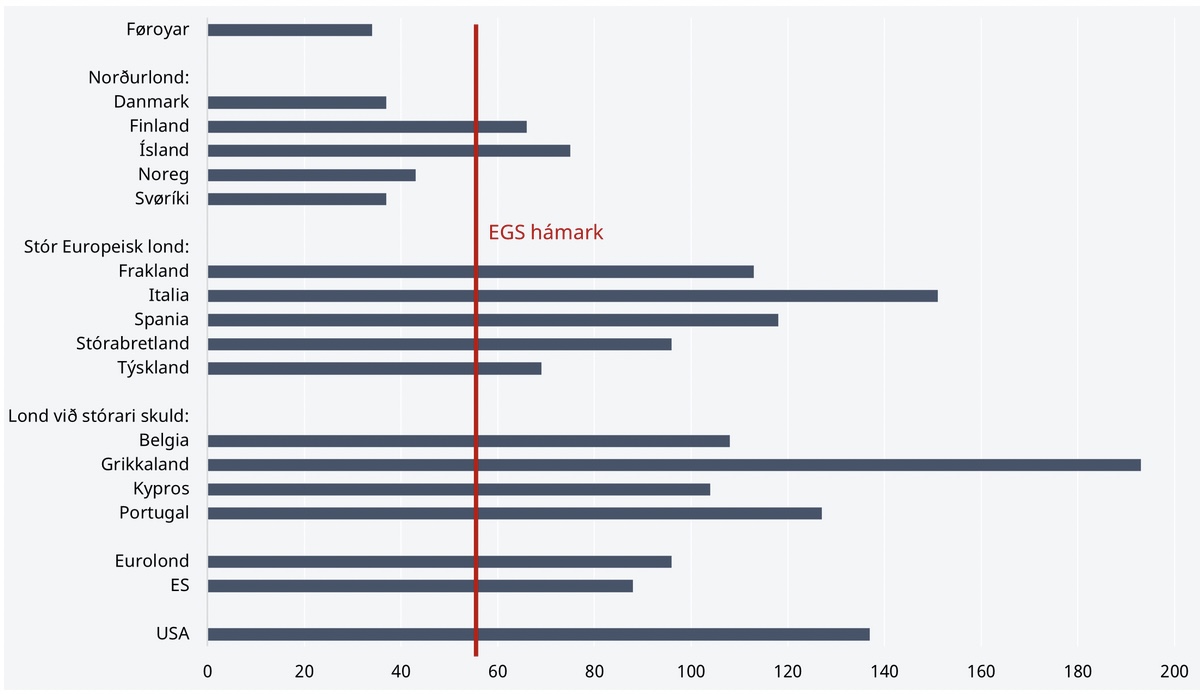Kelda: Landsbanki Føroya (Føroyar), tradingeconomics.com (Ísland og Noreg) og Eurostat. Viðm.: Almenn bruttoskuld í ymsum londum 2021, EGS-skuld, almenn fyrisiting og tænastur (almennar fyritøkur ikki íroknaðar).