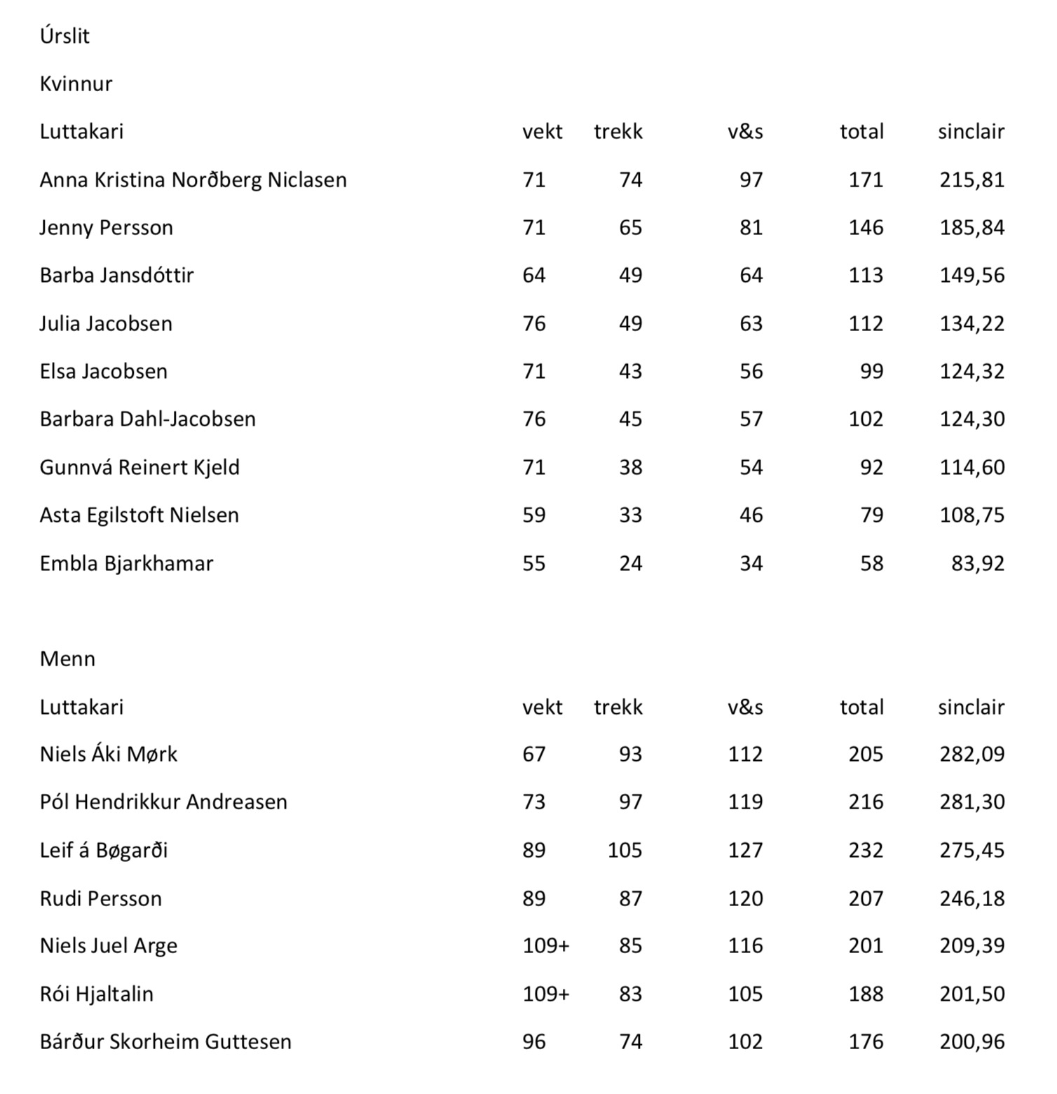Enn mugu hesar tó hyggja langt eftir Annu Kristinu Norðberg Niclassen, sum vann ein greiðan sigur. Anna Kristina lyfti ávíkavist 77 og 97 kilo í trekk og vend & stoyt, og tað gav henni sigurin í sínum vektflokki umframt samlaða sigurin, har lyftini verða roknað í mun til kropsvekt eftir sonevnda Sinclari-stiganum.