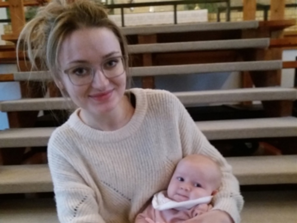 Hon er her við fyrsta barni sínum, tríggjar mánaðar gomlu dóttrini, Anna Winther Knudsen, sum var doypt leygardagin í somu kirkju.