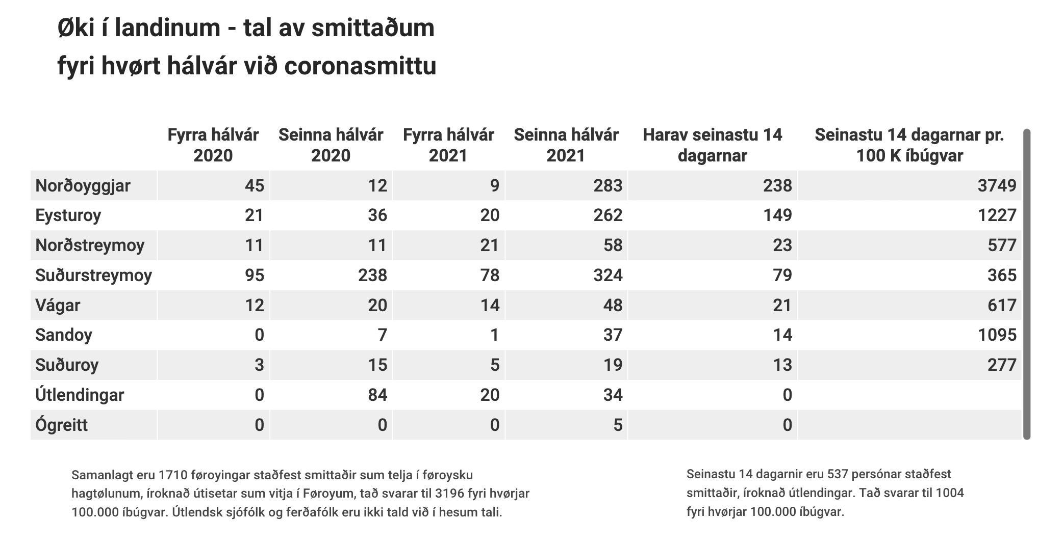 Støðan er nógv ringast í Norðuroyggjum, har 47,4 prosent av teimum smittaðu eru. Næst harðast rakta økið er Eysturoy, har eru 15,5 prosent av teimum smittaðu í løtuni.