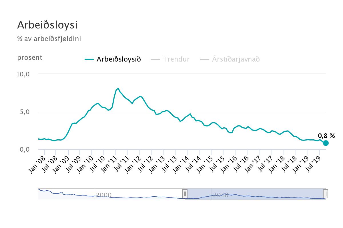 Arbeiðsloysið í september mánaði í fjør var 0,9 prosent, og tað var tað lægsta nakrantíð. Tað metið varð longu sligið mánaðin eftir, tí tølini fyri oktober mánaða vísa, at arbeiðsloysið var tá 0,8 prosent. Tað er ein lækking á 0,4 prosent samanborið við oktober mánaða í 2018, tá arbeiðsloysið var 1,2 prosent.