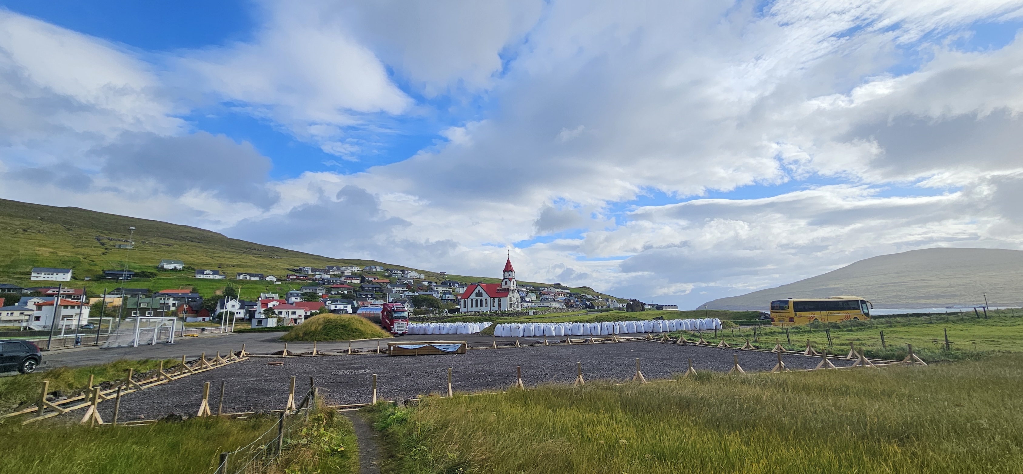 Gjørt verður nú klárt til at stoypa kantarnar, og ljósi og góði sandurin, sum er serliga væl egnaður til strandaflogbólt, og sum longu er komin til landið, verður skjótt fyltur inn á vøllin. Hetta er ein spennandi og sjónlig verkætlan, sum fer at seta sítt serliga dám á ítróttaøkið í kommununi. Vága kommuna takkar Flogbóltssambandi Føroya og formanninum, Peter Holm fyri góða ráðgeving og samstarv í samband við hesa stóru verkætlanina, sum eisini sæst á heimasíðuni fyri Oyggjaleikirnar: faroeislands2027.fo.