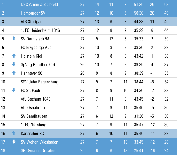 Arminia Bielefeld er framvegis seks stig frammanfyri Hamburg SV, sum er eitt væl størri felag við stoltari søgu í bestu deildini. Tað sama kann sigast um Stuttgart, ið tapti 3-2 móti Holstein Kiel og er sjey stig aftanfyri Arminia Bielefeld.