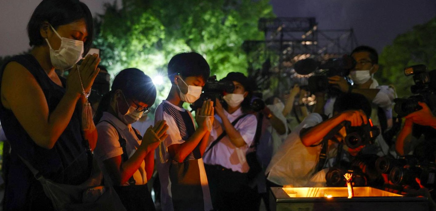 Á einum minningarhaldi á 77 ára degnum fyri kjarnorkubumbuna, sum varð tveitt niður yvir japanska býin, Hiroshima, heita borgarar í býnum á heimin um frið.