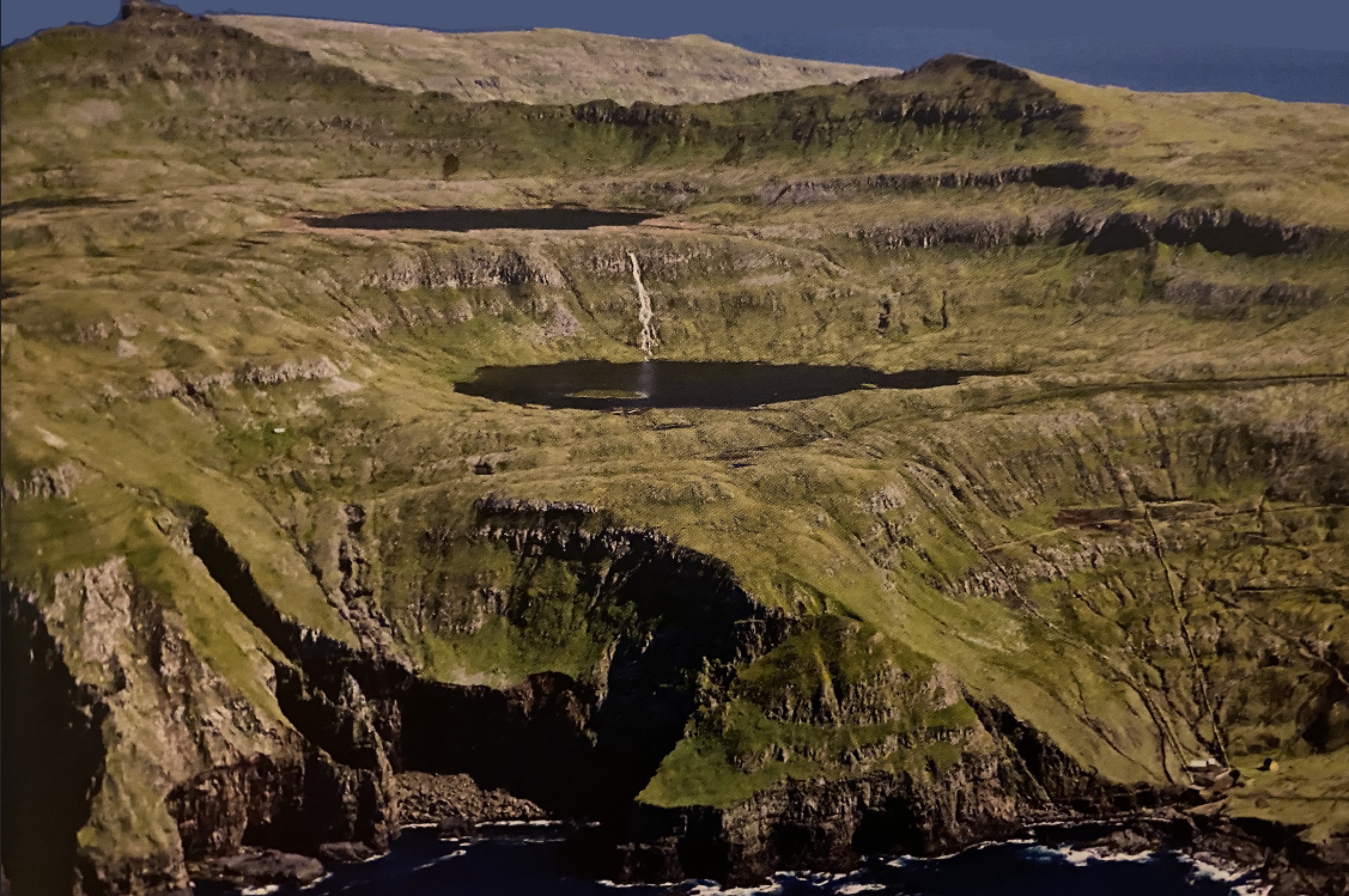 Oman fyri Botn, Vági, síggjast Ryskivatn, Mittvatn og Vatnið í Tindalíð og oman fyri tey Borgarknappur (vm.) og Hvannafelli (hm.). Vm. Borgarknapp og Hvannafelli síggjast í bakgrundini Ennið, Kolheyggjurin og Hovstúgvan. Fremst í myndini er elverkið í Botni. Mynd: Ólavur Frederiksen