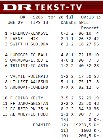 Av teimum 13 dystunum, ið vóru á Tips 13 veddingarseðilinum hjá Danske Spil í kvøld var dysturin millum Ferancvaros og KÍ tann ovasti.