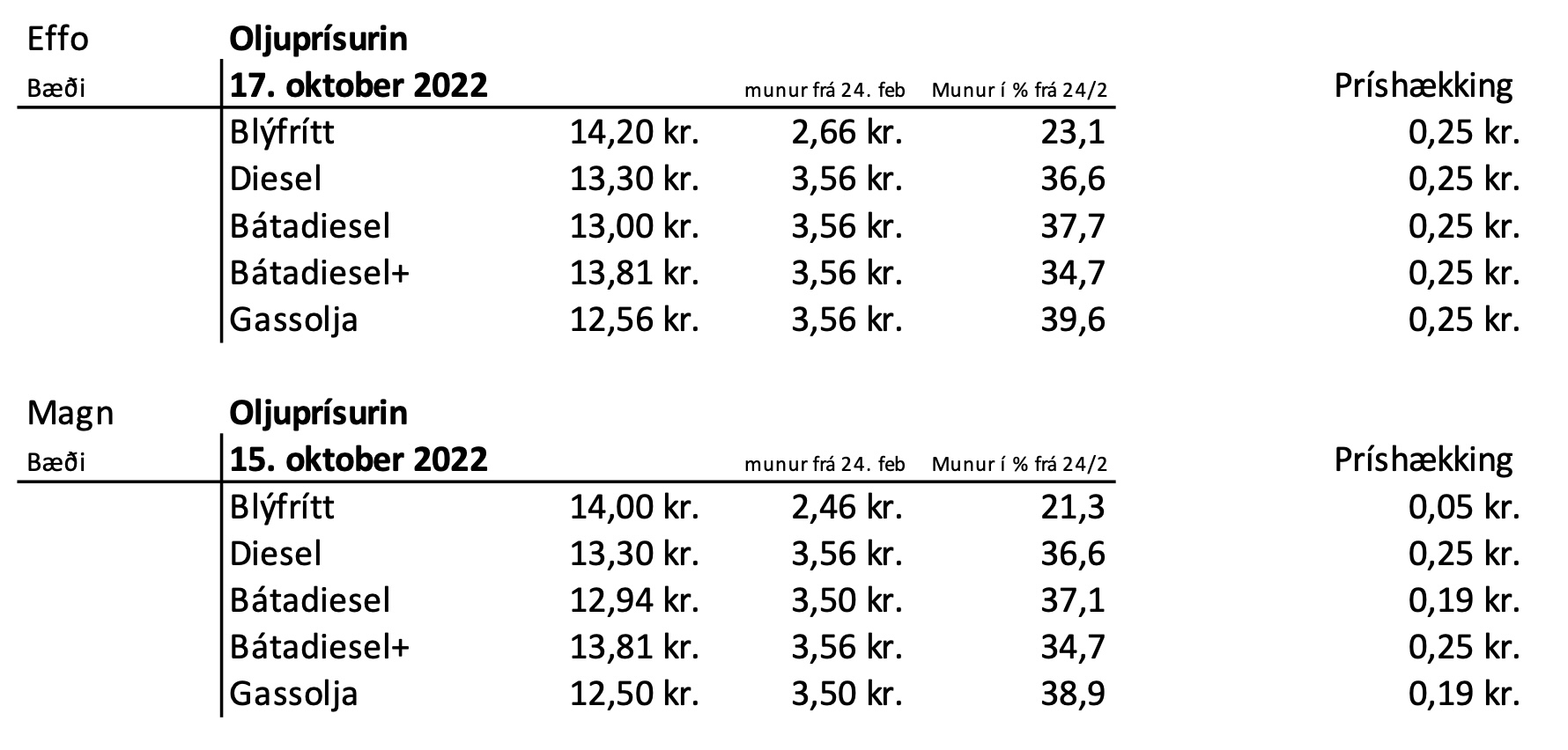 Hjá Effo kostar ein litur av bensini 14,20 krónur, diesel 13,30 krónur, bátadiesel 13 krónur, bátadiesel+ 13,81 krónur og húsarhaldsoljan kostar 12,56 krónur liturin.