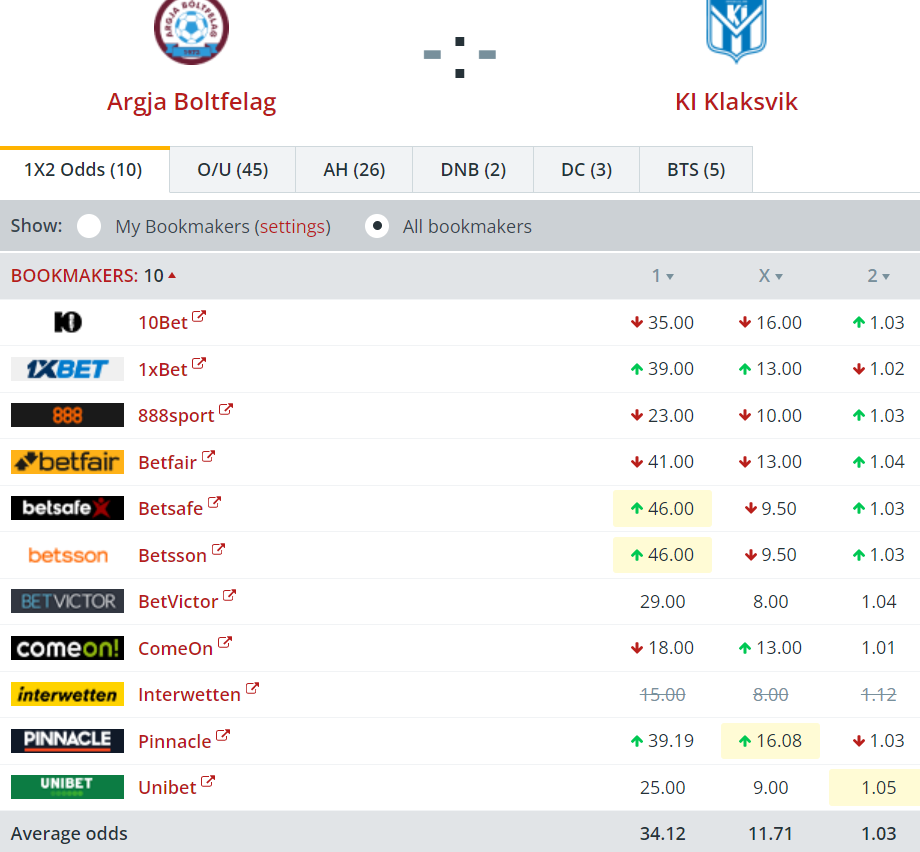 KÍ og HB eru risastórir favoritar til at vinna á útivølli. Hægstu oddsini upp á sigur til KÍ eru bara 1,05. Lægstu oddsini upp á sigur til AB eru 18,00: