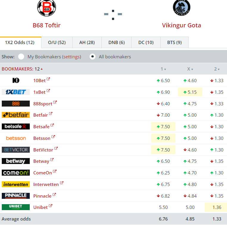 B36 er einasta heimaliðið, ið er favorittur hjá veddingarfyritøkunum hetta umfarið. Talan er um eina eitt sindur minni favorittstøðu enn hana Víkingur hevur móti B68, men kortini ein rættiliga greið favorittstøða. Hægstu oddsini upp á heimasigur til B36 eru 1,50. Lægstu oddsini upp á ein útisigur til 07 Vestur eru 5,50: