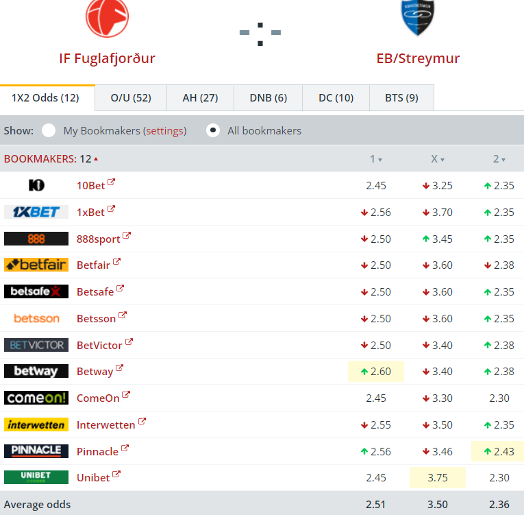 Altjóða veddingarfyritøkurnar vænta bara ein javnan dyst í Fuglafirði. Lítið skilur ÍF og EB/Streym. Miðaloddsini upp á sigur til ÍF eru 2,51 og miðaloddsini upp á sigur til EB/Streym eru 2,36: