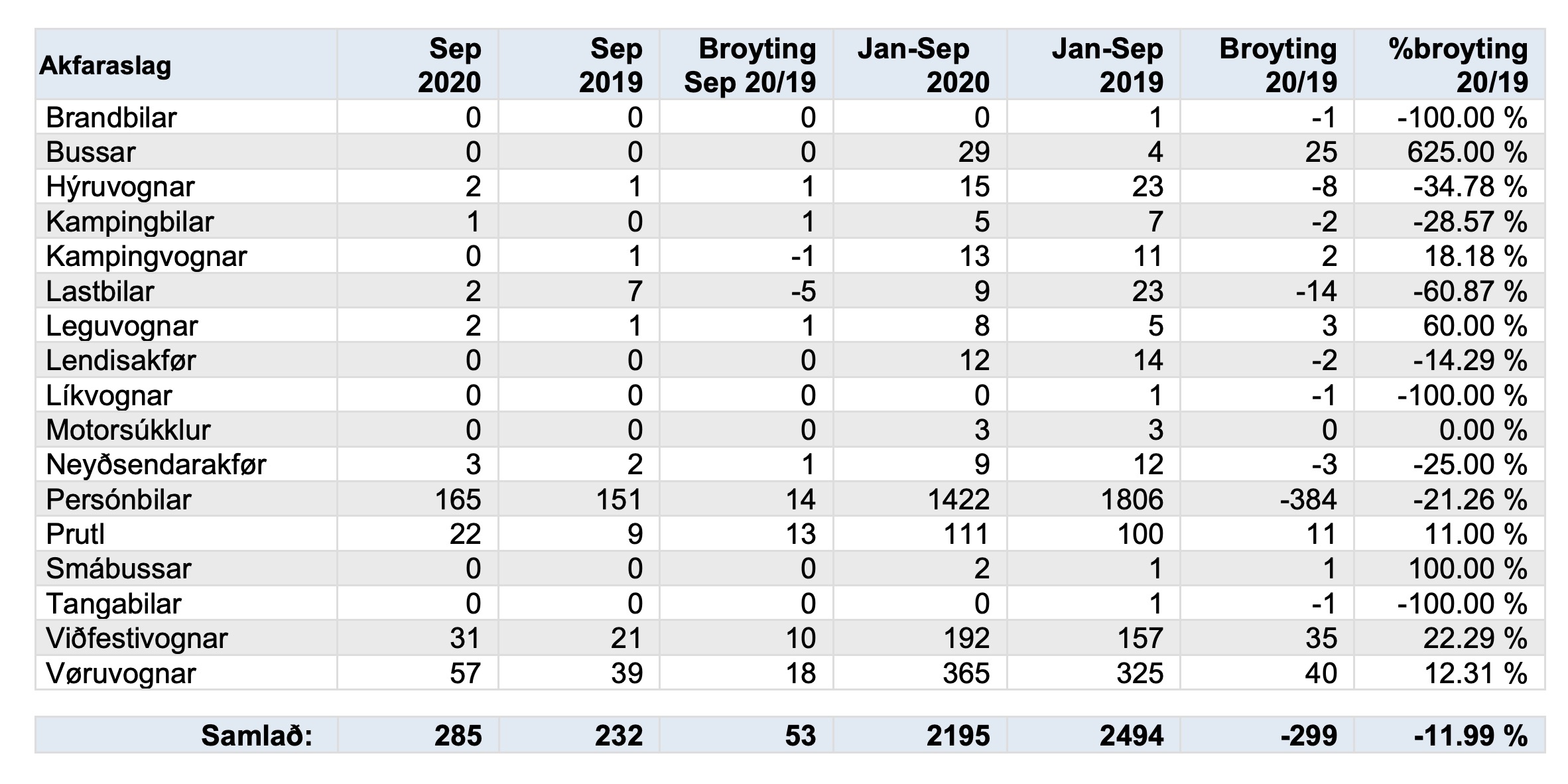 Í september vóru seldir 165 nýggir persónbilar í mun til 151 í september í fjør. Tað er ein framgongd upp á 14. Men fyri alt árið higartil er tó talan um eitt fall í søluni frá 1422 bilum í ár í mun til 1806 sama tíðarskeið í fjør.
