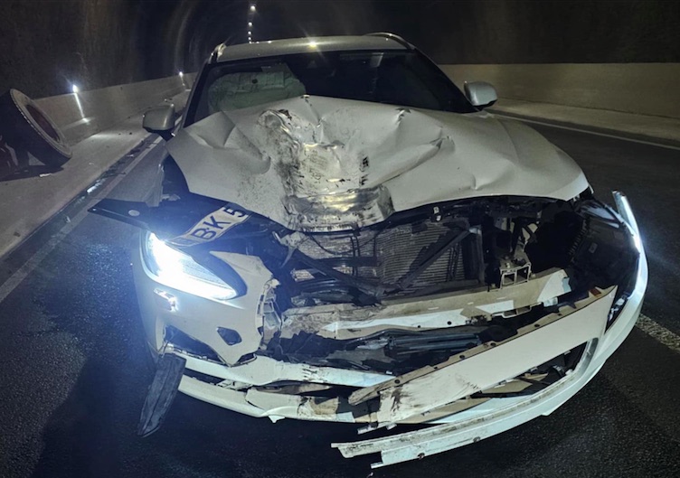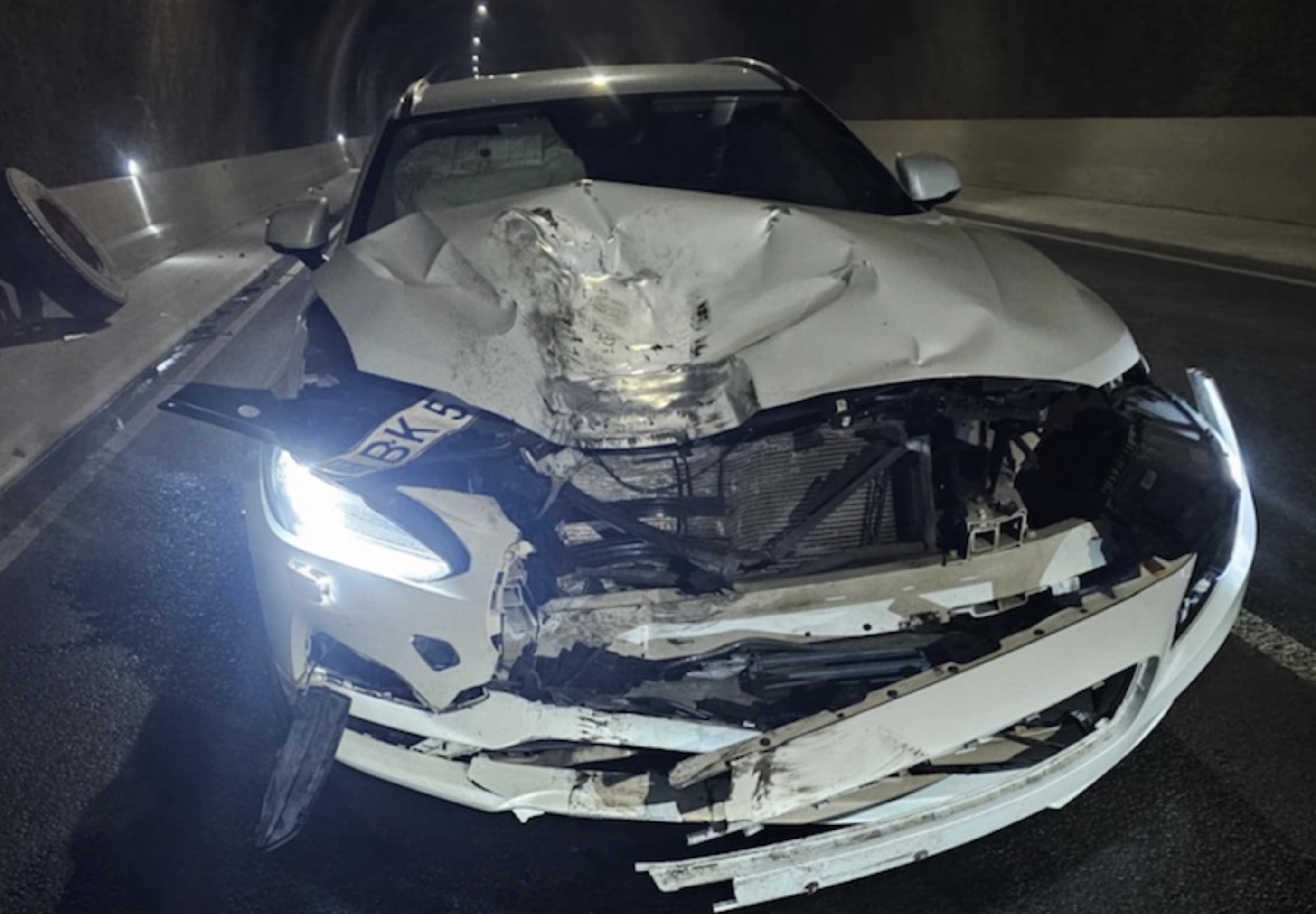 Persónbilurin, sum varð raktur av einum stórum lastbiladekki í Sandoyartunlinum seinnapartin, var á veg í Sandoynna, og lastbilurin var á veg úr Sandoynni.