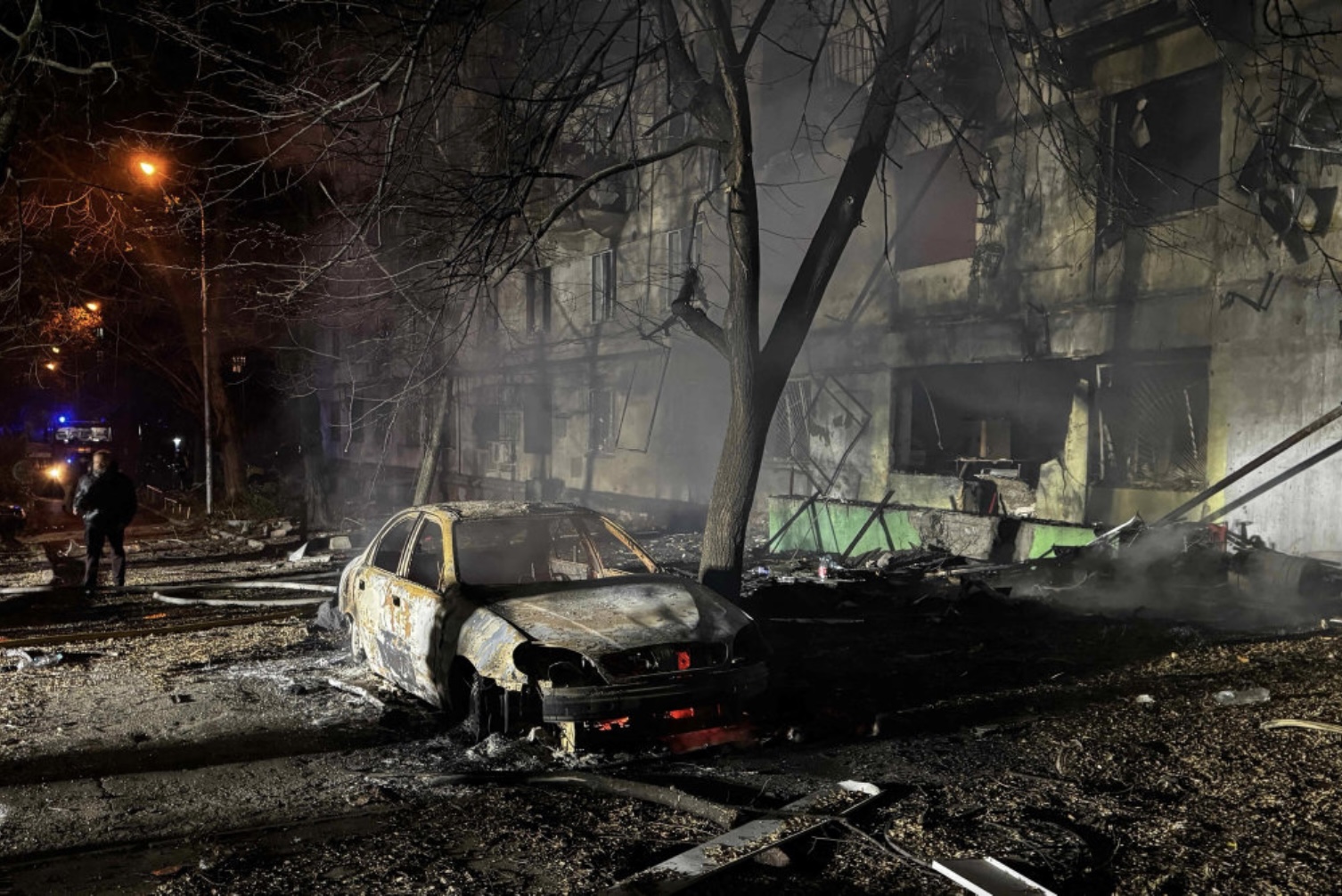 Myndir á sosialu miðlunum vístu sløkkiliðsfólk arbeiða við at sløkkja eld í háhúsum, umframt útbrend akfør á býargøtum.