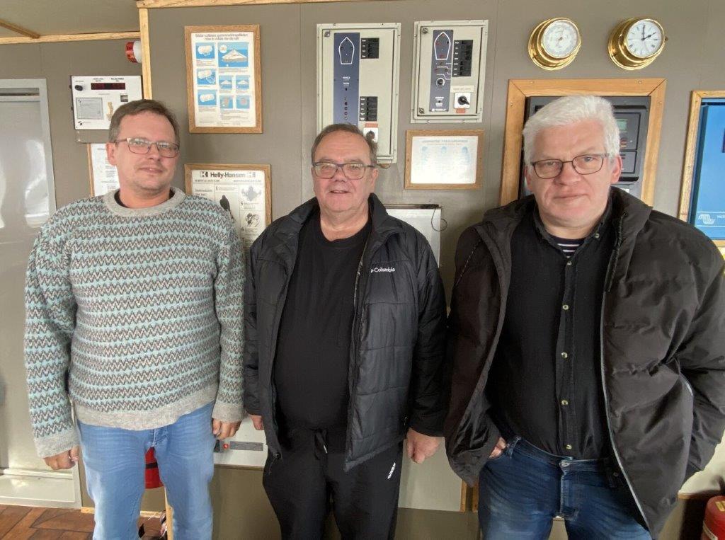 Mynd. Brúgvamenninir á Eivindi: Jan Vang, skipari, Heri Ellingsgaard, stýrimaður og avloysaraskipari og Magnus Johansen, stýrimaður.