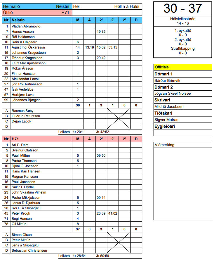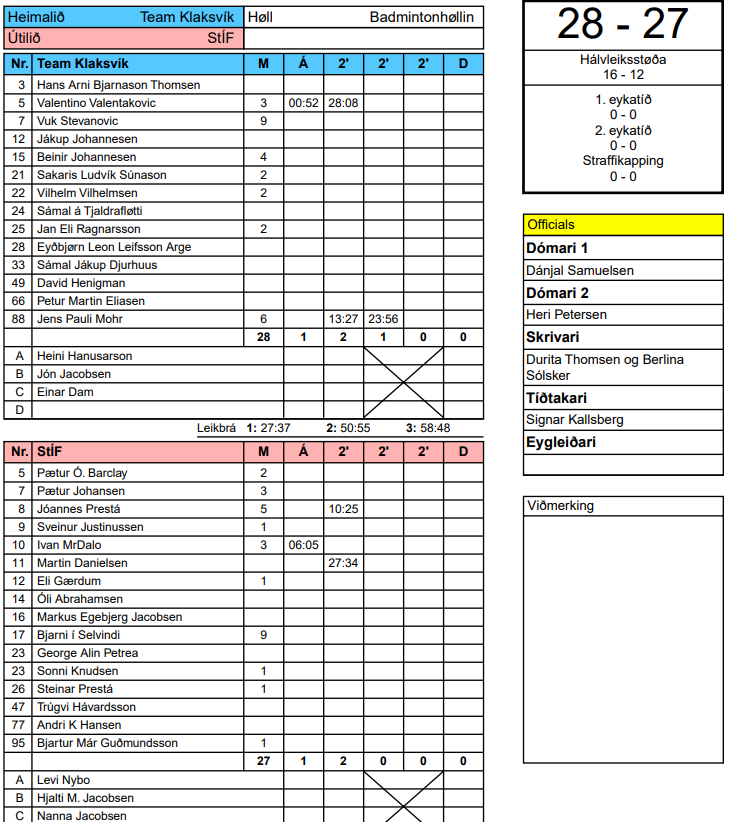 Team Klaksvík-StÍF 28-27 (16-12) - Dómaraseðlar frá HSF síggjast undir her: