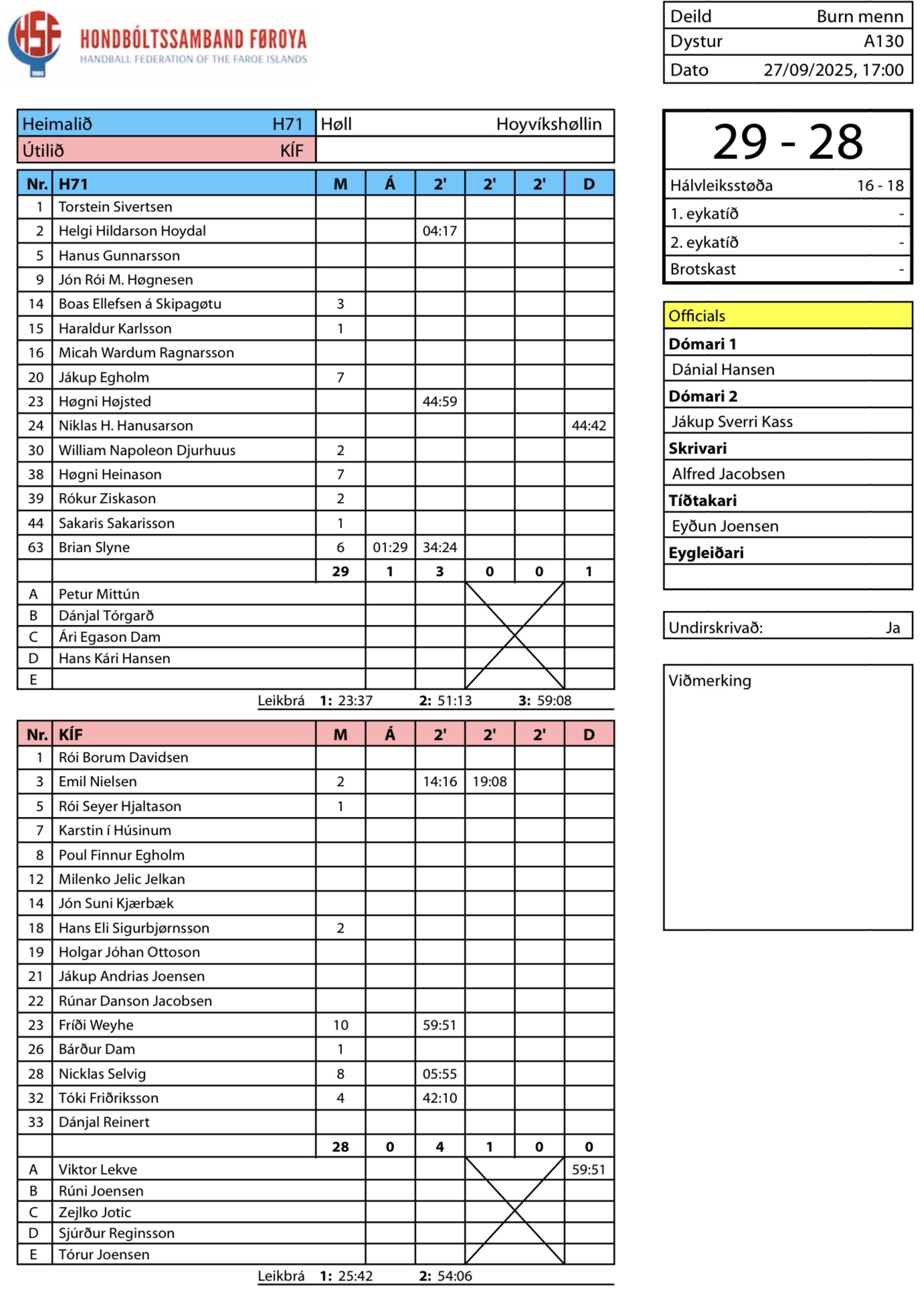 HER ber til frá HSF at síggja dómaraseðilin frá dystinum millum H71 og KÍF: