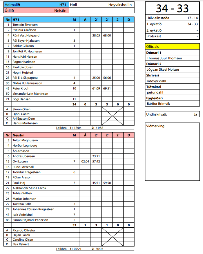 HER er dómaraseðilin frá HSF frá triðju FM-hálvfinaluni H71-Neistin 34-33 (29-29 - 17-14):
