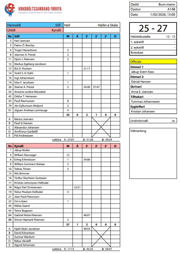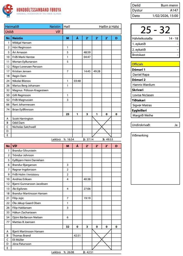 HER ber til frá HSF at síggja dómaraseðlarnar frá dagsins dystum, umframt støðuna í deildini: