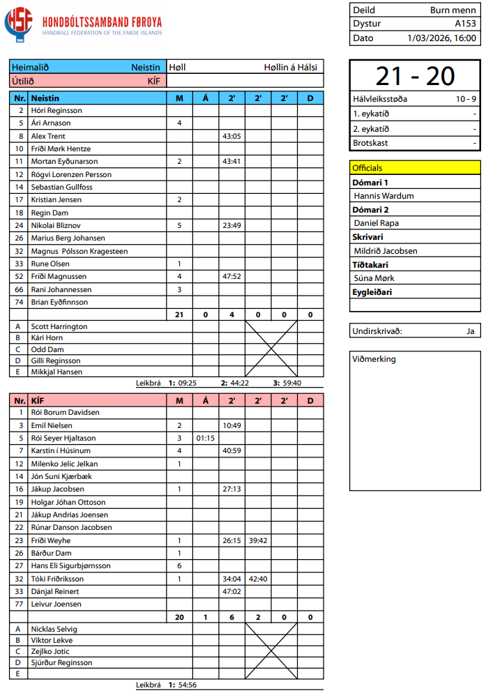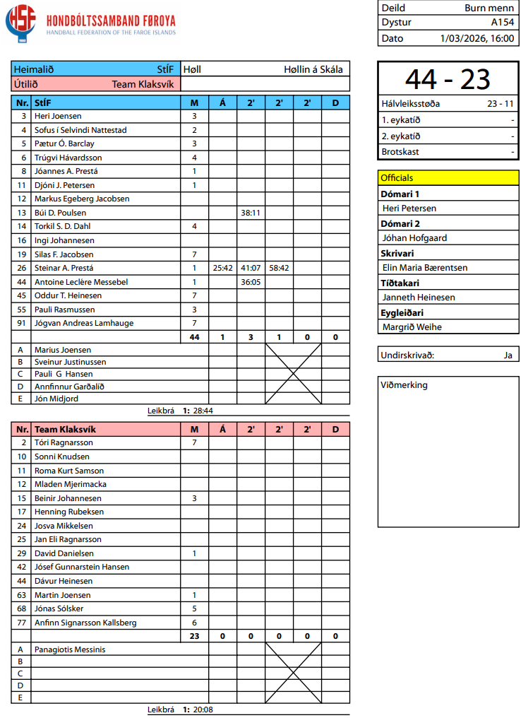 HER ber til frá HSF at síggja dómaraseðlarnar frá dagsins dystum, umframt støðuna í deildini:
