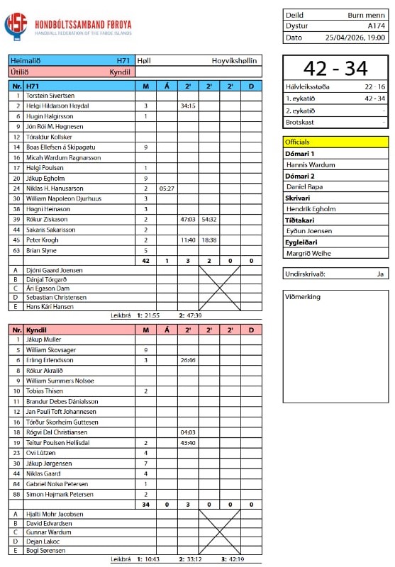 Í kvøld vann H71 stórsigur 42-34 á Kyndli í Hoyvíkshøllini. Í steðginum var støðan 22-16 til H71. Onkrar løtur í seinna hálvleiki vóru 10 mál á muni.