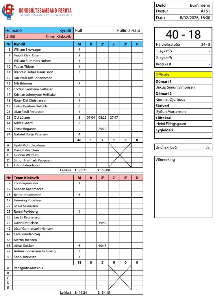 HER ber til frá HSF at síggja dómaraseðlarnar frá dagsins dystum, umframt støðuna:
