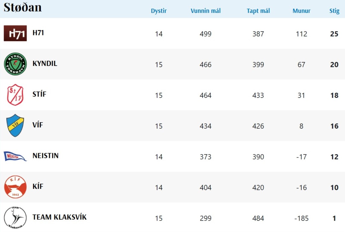 Í høllini í Kollafirði vann H71 stórsigur 41-25 á KÍF. Hoyvíkingar vóru flúgvandi í fyrra hálvleiki, og í steðginum vóru teir frammanfyri við 13 málum, 25-12.