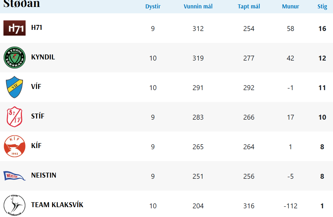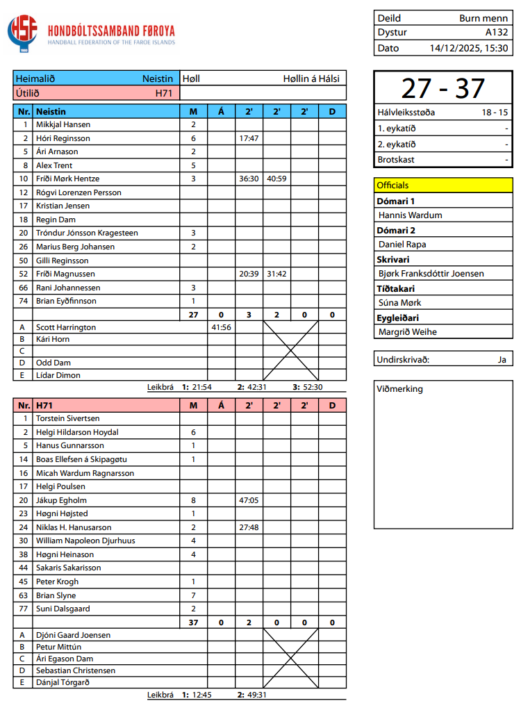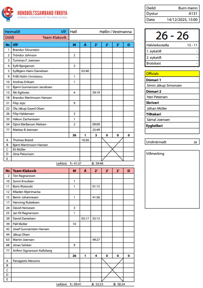 HER ber til frá HSF at síggja dómaraseðlarnar frá dagsins dystum, umframt støðuna: