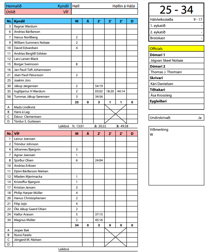 Her er dómaraseðilin frá HSF frá dystinum millum Kyndil og VÍF: