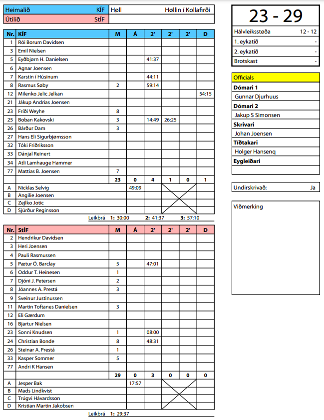 HER ber til síggja dómaraseðilin hjá HSF frá dystinum KÍF-StÍF 23-29 (12-12)