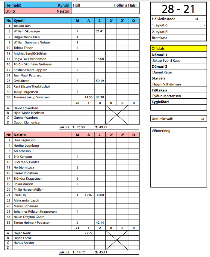 HER ber til síggja dómaraseðilin hjá HSF frá dystinum Kyndil-Neistin 28-21 (14-11)
