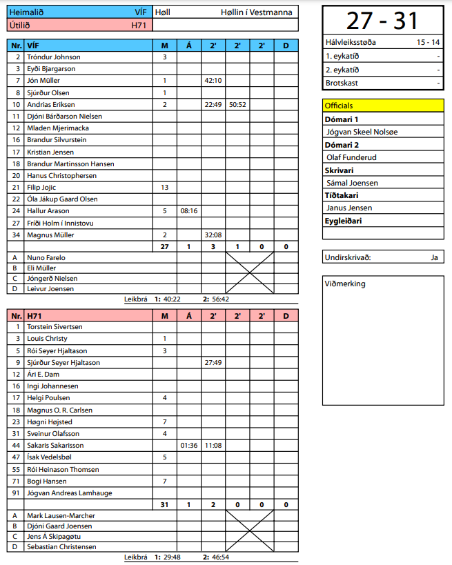 HER ber til síggja dómaraseðilin hjá HSF frá dystinum VÍF-H71 27-31 (15-14)