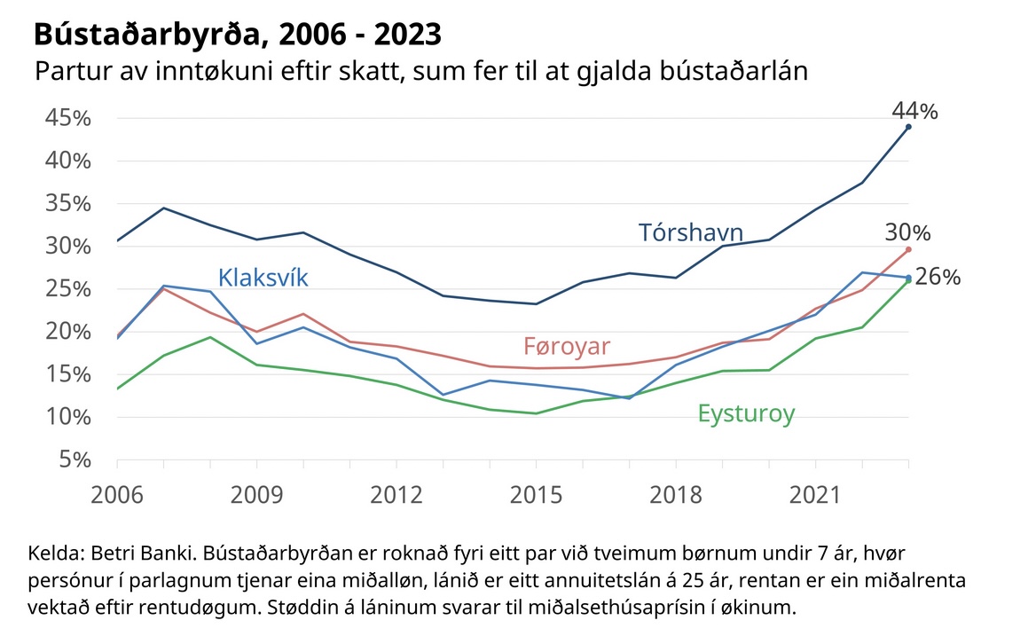 Bústaðarbyrðan var 44% í Tórshavn, 26% í Eysturoynni og Klaksvík, og 30% í øllum landinum í miðal í 2023. Í Klaksvík er bústaðarbyrðan minkað eitt vet í í 2023 í mun til 2022. Hetta kemur av, at bústaðarbyrðan vaks í 2022 vegna øktum miðalprísi á sethúsum í Klaksvík í 2022. Í 2023 vaks miðalprísurin ikki eins nógv, og tí sæst eitt lítið fall í bústaðarbyrðuni í 2023. Miðalprísurin á sethúsum í Klaksvík sveiggjar vegna tað, at tað eru lutfalsliga fáar sølur í Klaksvík, og tí kunnu einstakar sølu toga miðalprísin annan vegin.