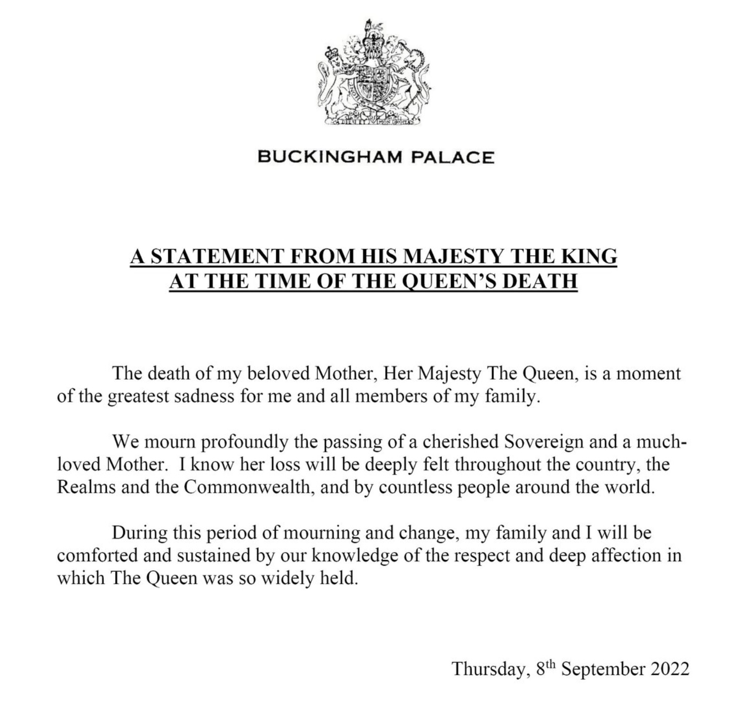 – Vit syrgja djúpt, at ein virðismettur monarkur er farin og ein ein høgt elskað móðir. Eg veit, at deyði hennara fer at merkjast í øllum landinum og kongaríkinum av fólki kring allan heimin allan, skrivar nýggi kongurin.