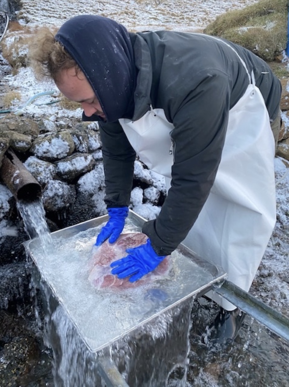 Kendi kokkurin Gutti Winther saman við hjálparkokkum stendur fyri gastronomiska partinum av tiltakinum. Millum nógv forvitnisligt fáa luttakararnir hesaferð fyri fyrstu ferð høvi at royna Dalsgarðsskinkuna.