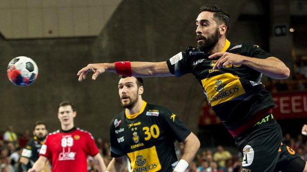 Russland gav Spania skarpan gang, men spaniumenn vóru kaldir í avgerandi løtum, og endaðu við at vinna 25-23 á Russlandi. Í steðginum var Russland annars á odda 13-12. Victor Tomas gjørdi toppskjútti hjá Spania við seks málum. Timur Dibirov gjørdist toppskjútti hjá Russlandi við fimm málum. Fyrr í dag vann Týskland 25-23 á Danmark, og Svøríki vann 22-14 á Ungarn.