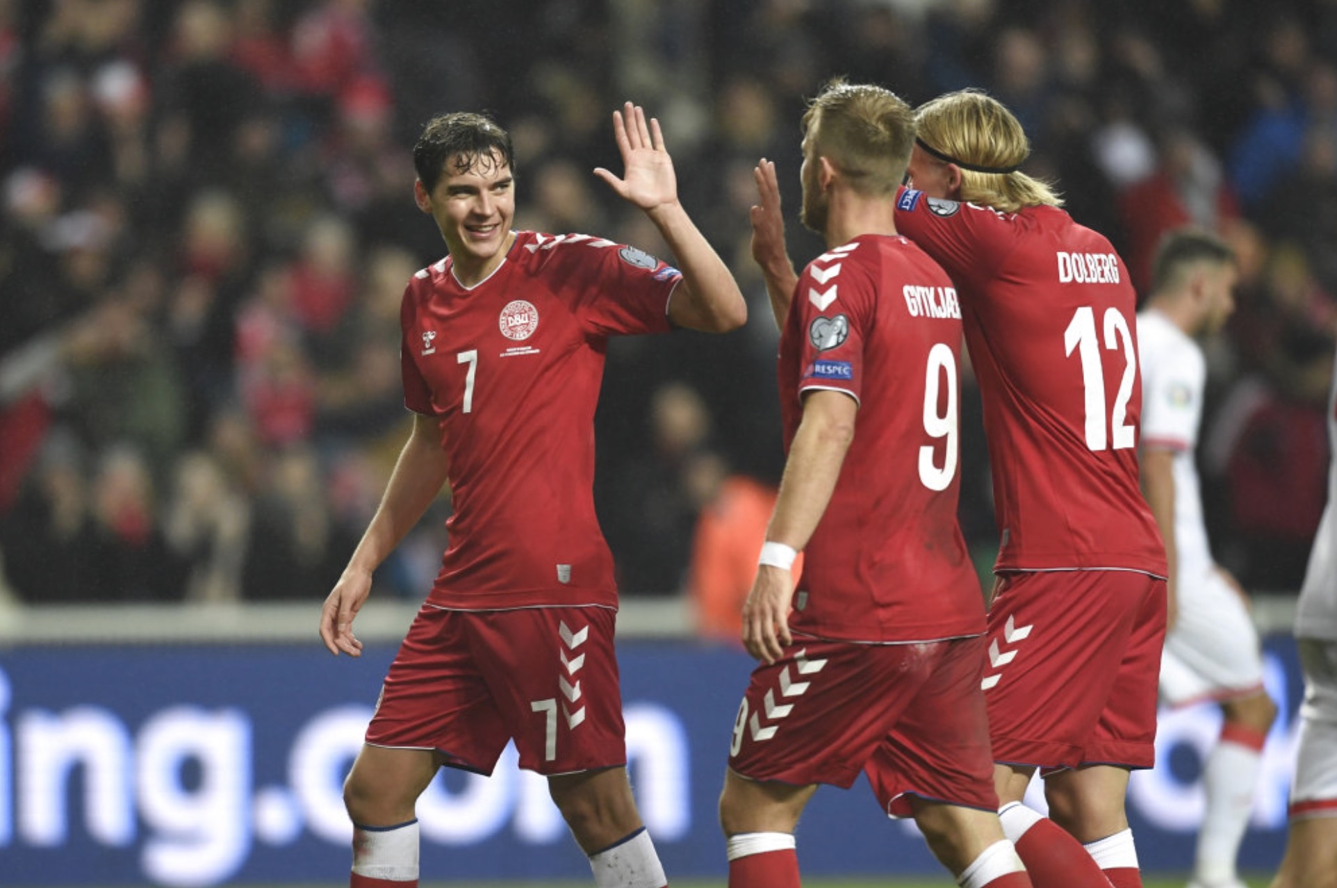 Robert Skov og Christian Eriksen skoraðu tvey mál í part, meðan Christian Gytkjær og Martin Braithwaite skoraðu hvør sítt mál.