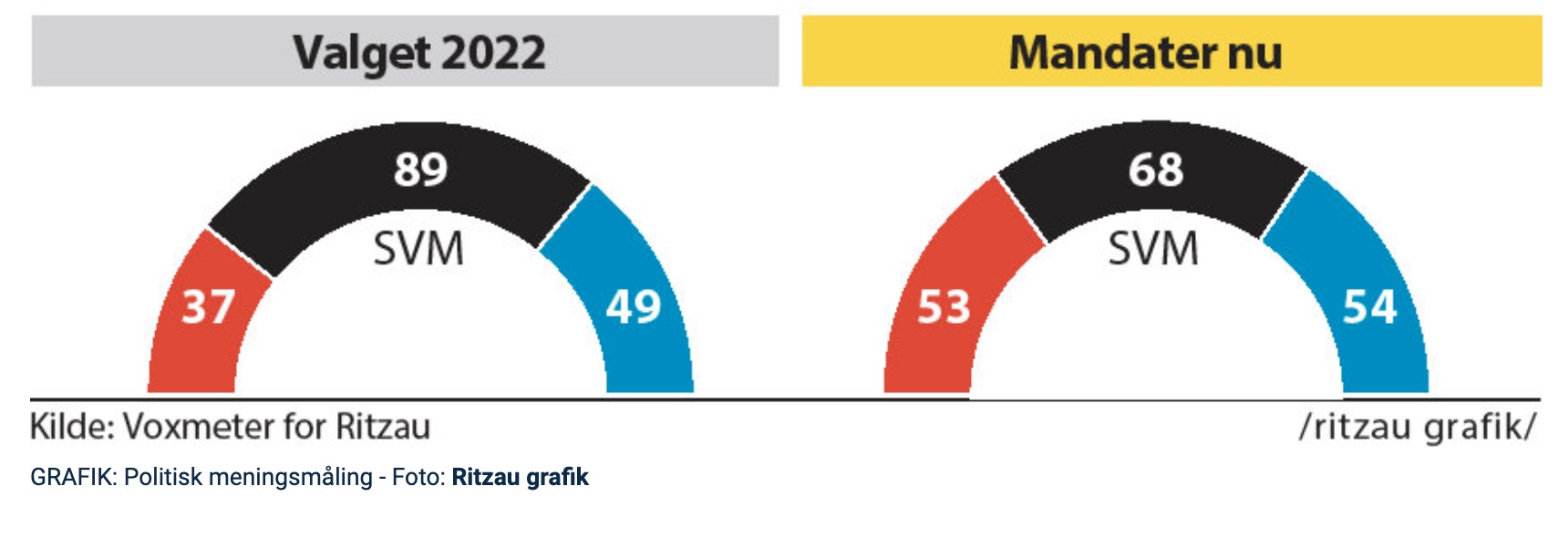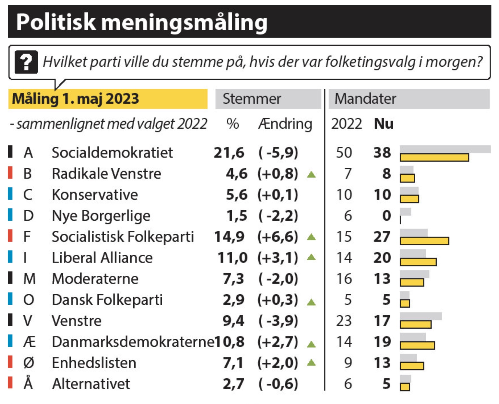 Flokkurin fær 21,6 prosent, sum er 5,9 prosentstig minni enn á valinum 1. november. Vinstri fær 9,4 prosent í kanningini, sum er 3,9 prosentstig minni enn á valinum, og Moderatarnir fáa 7,2 prosent, sum er 2,0 prosentstig minni enn á fólkatingsvalinum 1. november í fjør.