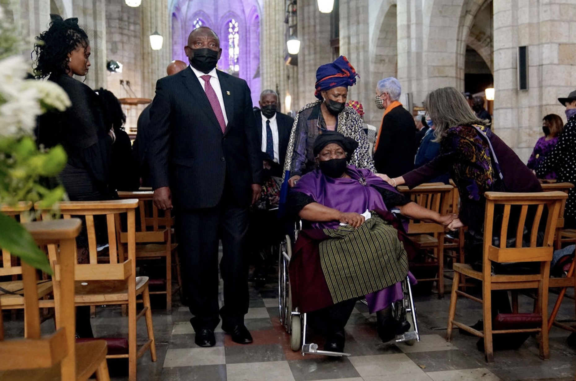 Eftir røðuna gav forsetin einkjuni hjá Tutu, Nomalizo Leah, tjóðskaparliga flaggið,sum er kent sum »Mama Leah«. Hon sat í koyristóli í fremstu røði í einum lillalittum turriklæð – kirkjuilgi liturin hjá manni hennara. Slipsið hjá Ramaphosa hevði sama lit.