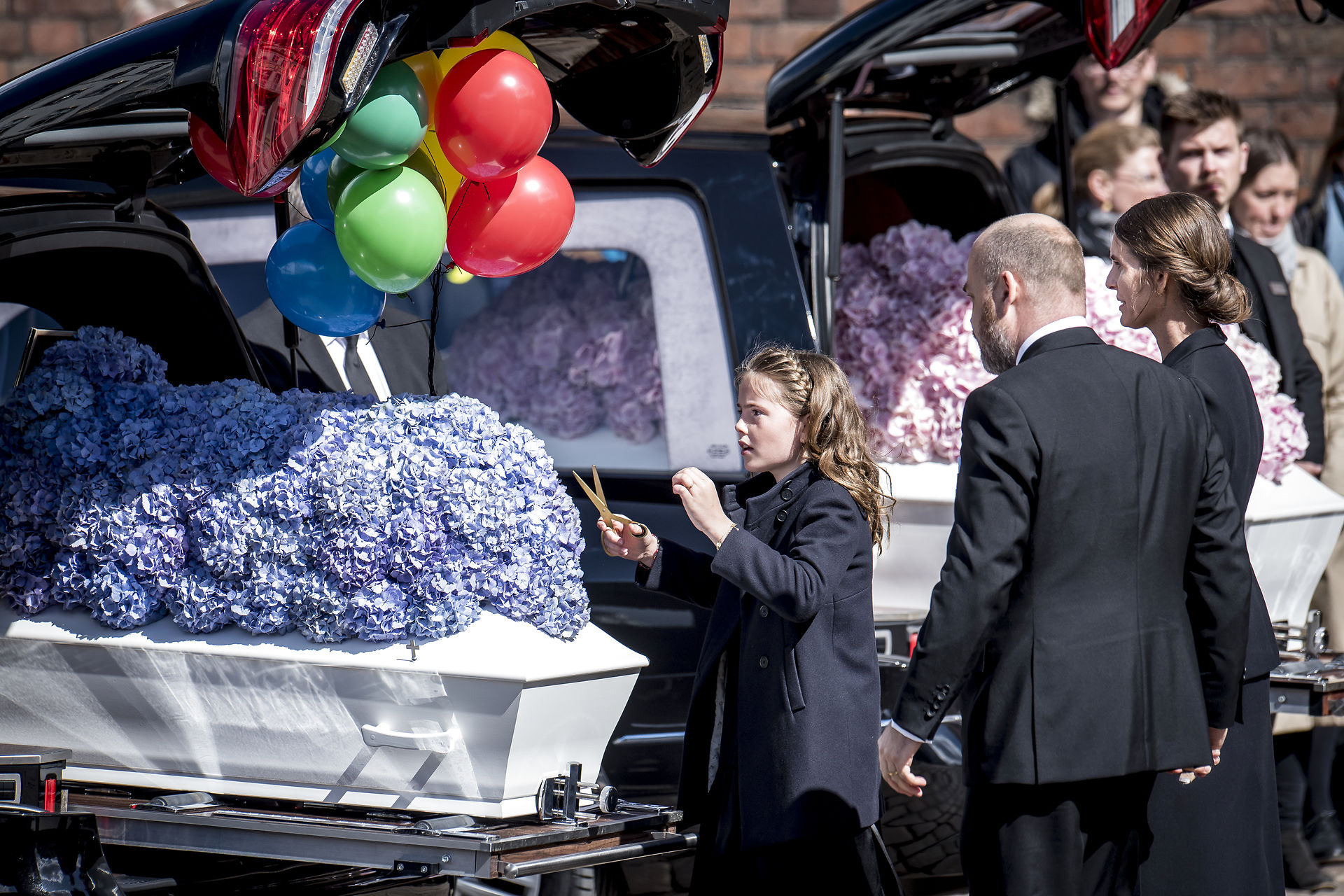 Ein av kistunum varð prýdd við ballónum. Eftir nakrar mittur í tøgn uttan fyri kirkjuna, klipti systir teirra deyðu bandið á ballónunum, sum fóru til upp í ta himmalbláu luftina.