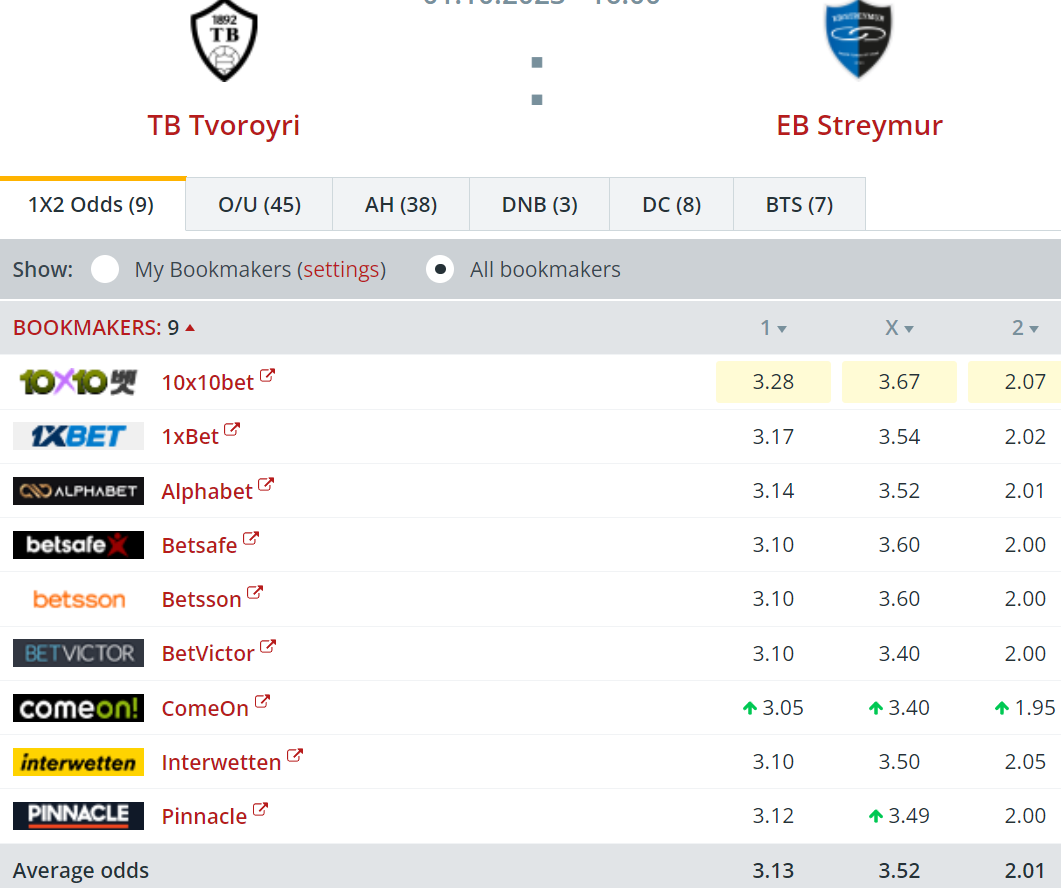 Níggju altjóða veddingarfyritøkur, ið lata odds upp á dystin hava tó EB/Streym sum ein lítlan favoritt til at vinna dystin.