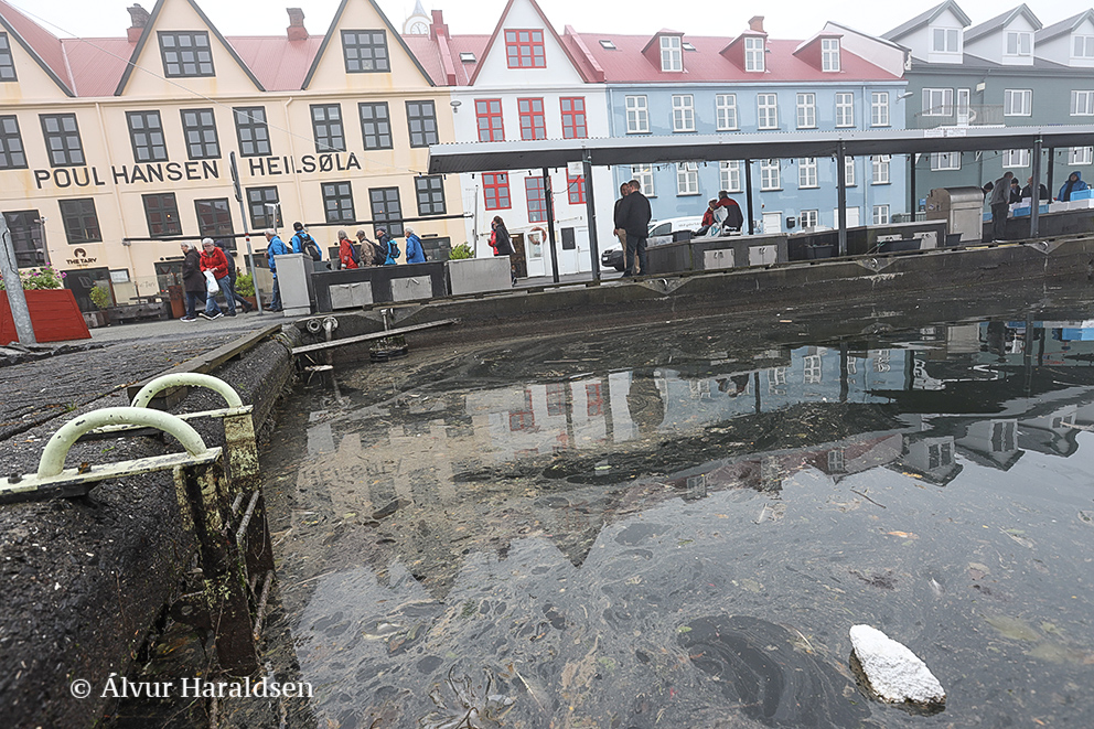 Mortan Johannesen, sum til gerandis selir fisk í Vágsbotni, fýlist á, at tað gongur so illa at halda sjógvin reinan inni í horninum fram við fiskasølutorginum.
