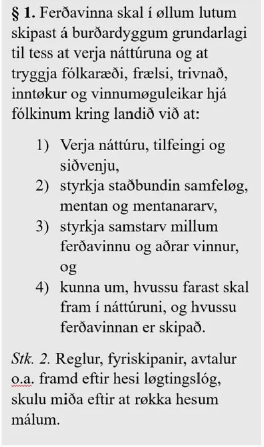 Endamálið við ferðavinnulógini er at skapa karmar um eina vinnu, ið verður náttúruni, fólkinum, sum her býr, og vinnuni, eisini landbúnaðinum, til størst møguligt gagn.